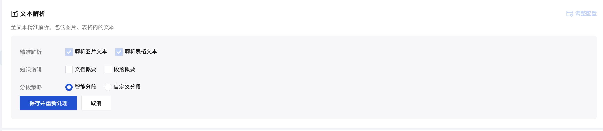 3. 配置完成后,点击保存并重新处理,文档会重新进入解析中状态。