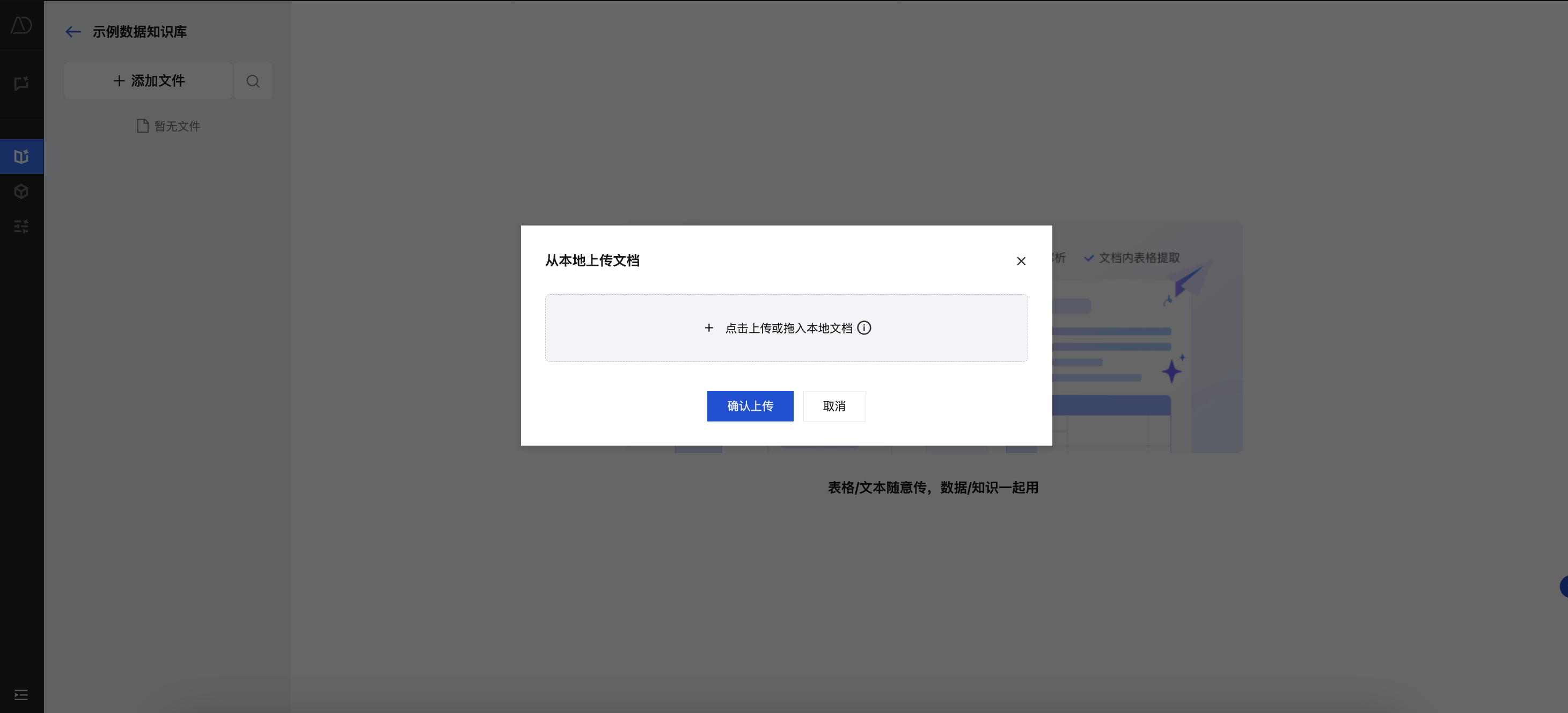 1. 进入已经创建的知识库,单击添加文件 > 从本地上传文档。