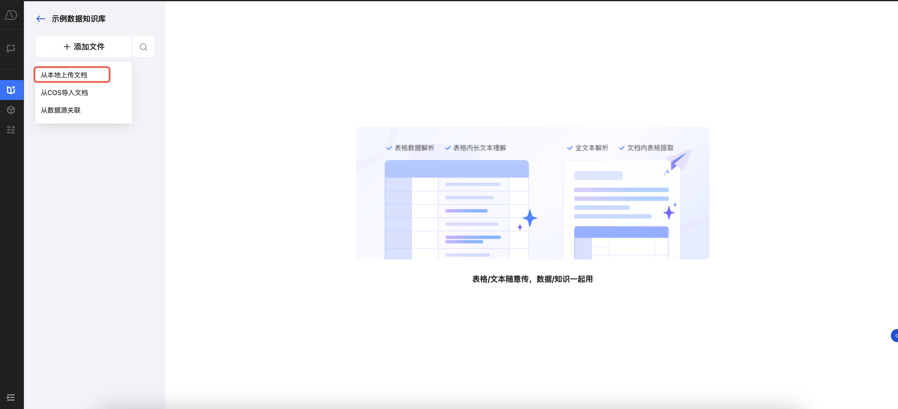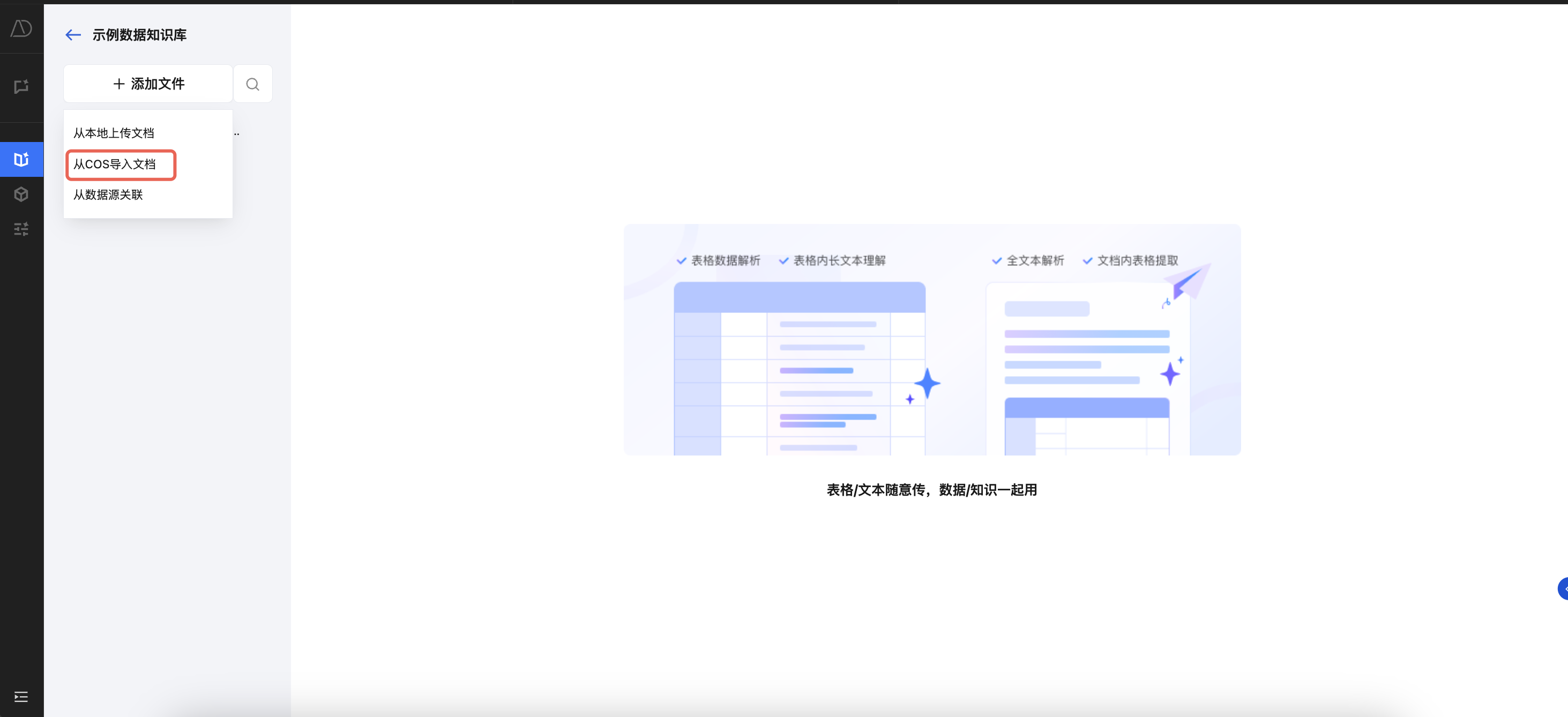 TCDataAgent 支持将各类文本文档解析为可问答的知识资产。向知识库添加文档时,您可从本地上传文档,也可从对象存储 COS 导入文档。添加文档后,TCDataAgent 将提取文本内容、语义信息,您可对其进行对话问答。