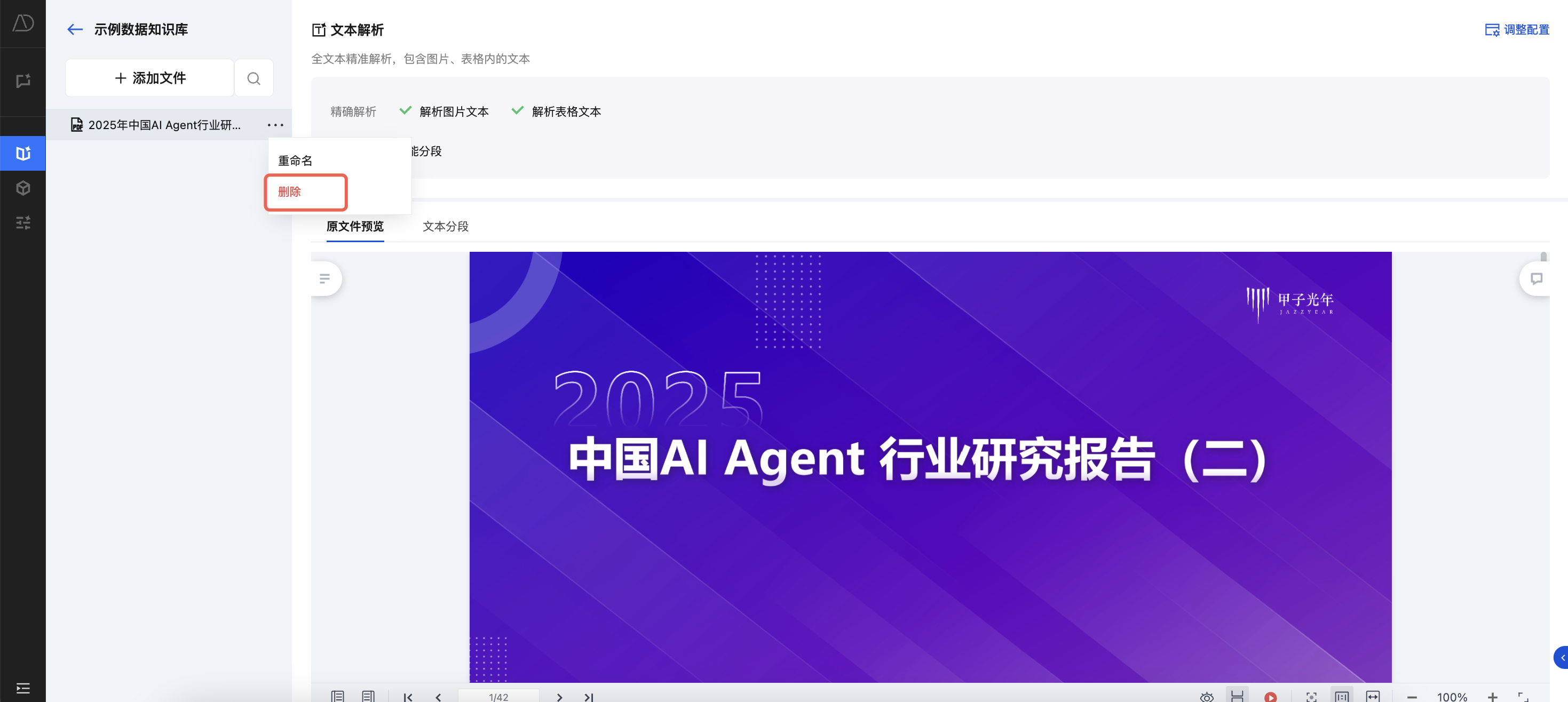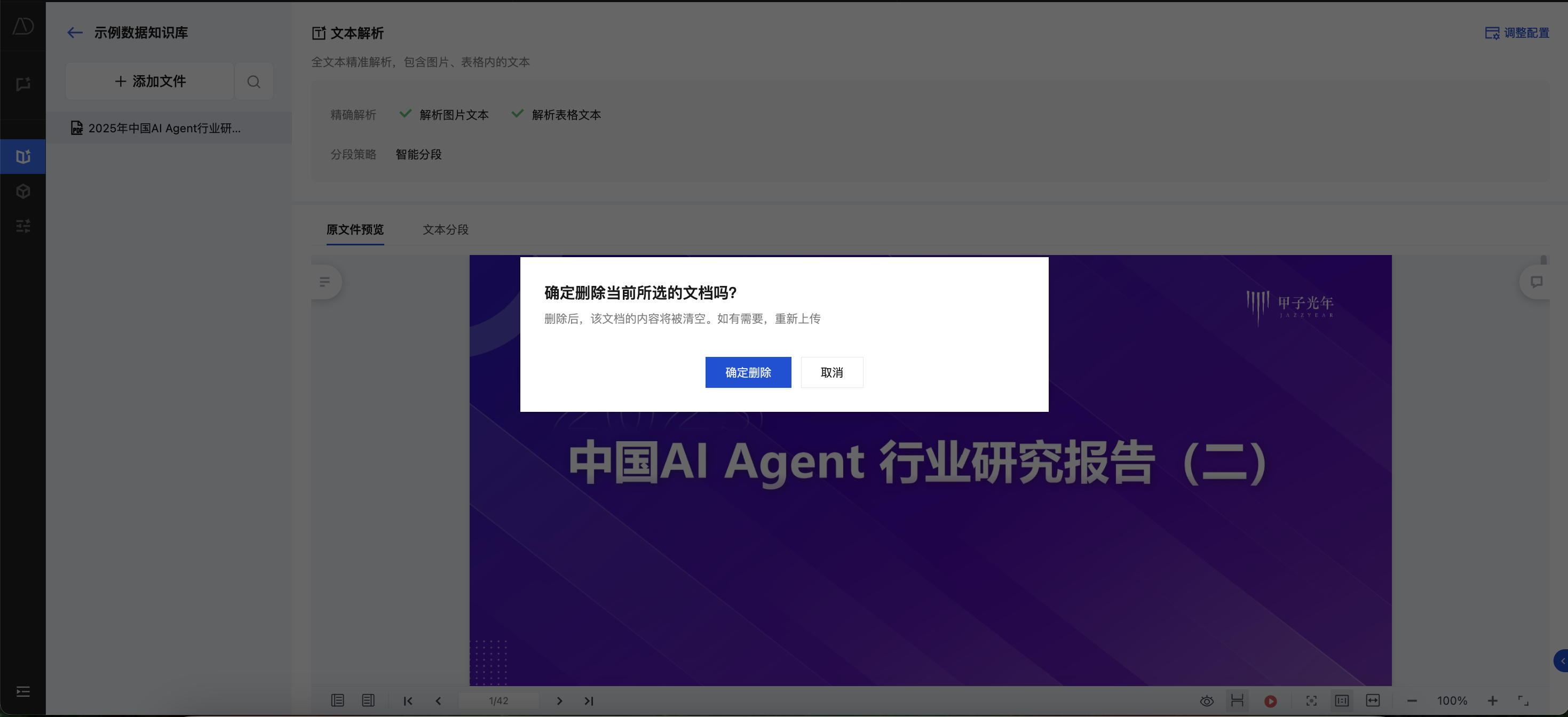 1. 进入 TCDataAgent 知识库,对于目标文档,单击删除。