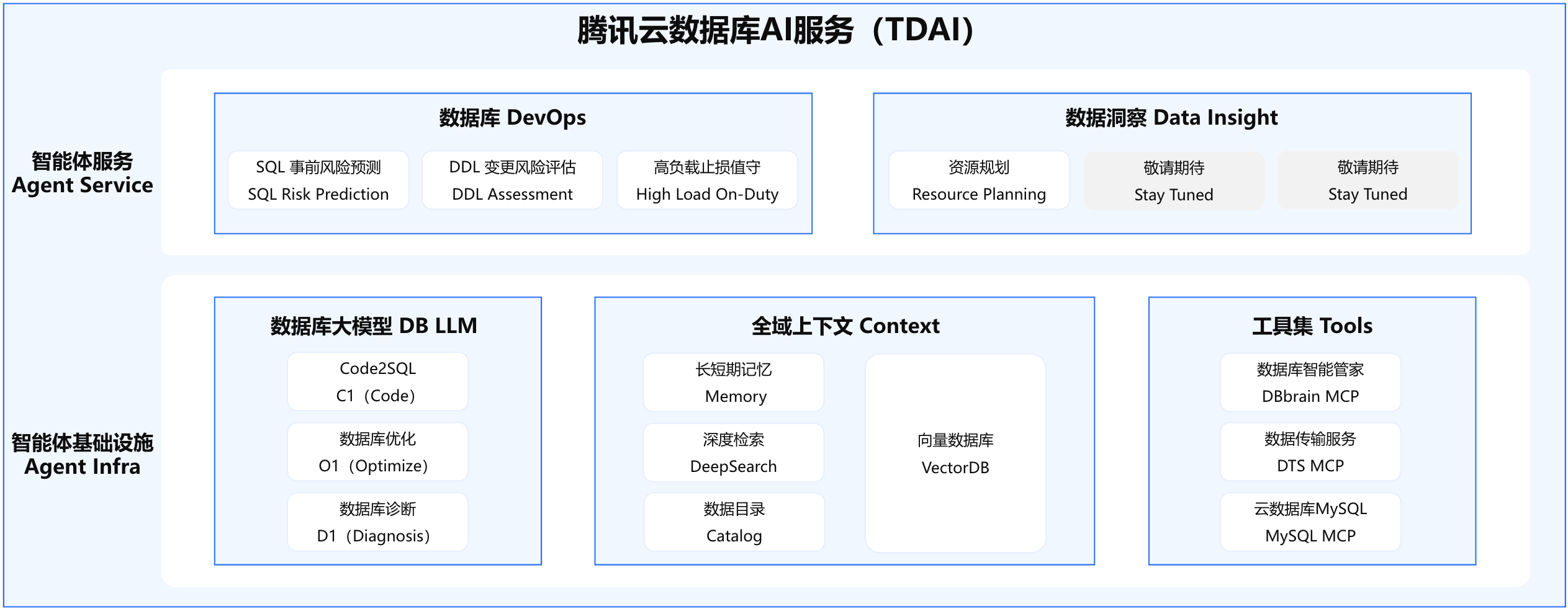 腾讯云数据库 AI 服务构建于智能体服务与智能体基础设施两大核心模块之上。智能体服务涵盖数据库 DevOps 与数据洞察,提供风险 SQL 治理、企业资源智能规划等能力;基础设施层依托自研数据库大模型(DB LLM)、全域上下文(Context)与工具集(Tools),为企业智能体提供专属垂类模型、私域数据基座,助力企业智能跃迁。