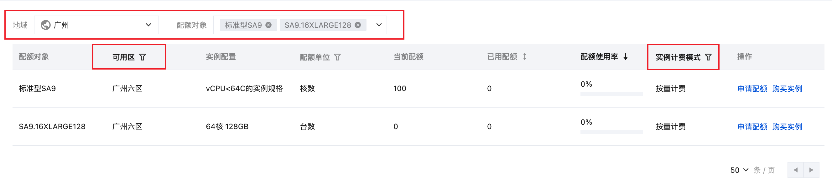 页面,通过选择地域、可用区和计费模式搜索实例,即可查看每个地域、每个可用区和特定计费模式下,具体机型的当前配额和已使用配额。