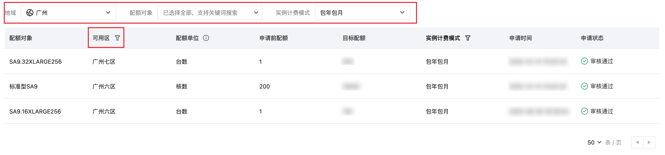 2. 在配额申请记录页面可查看配额申请进度以及结果,可通过选择地域、可用区、配额对象和实例计费模式进行筛选,快速定位配额申请记录。