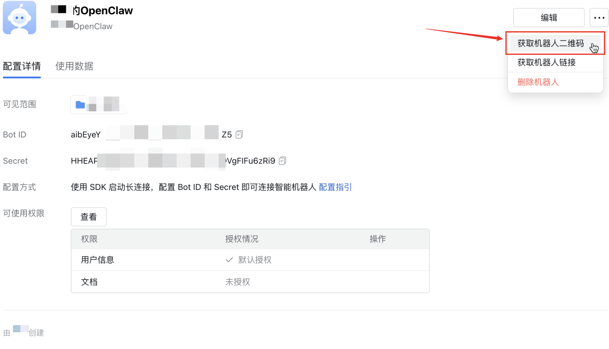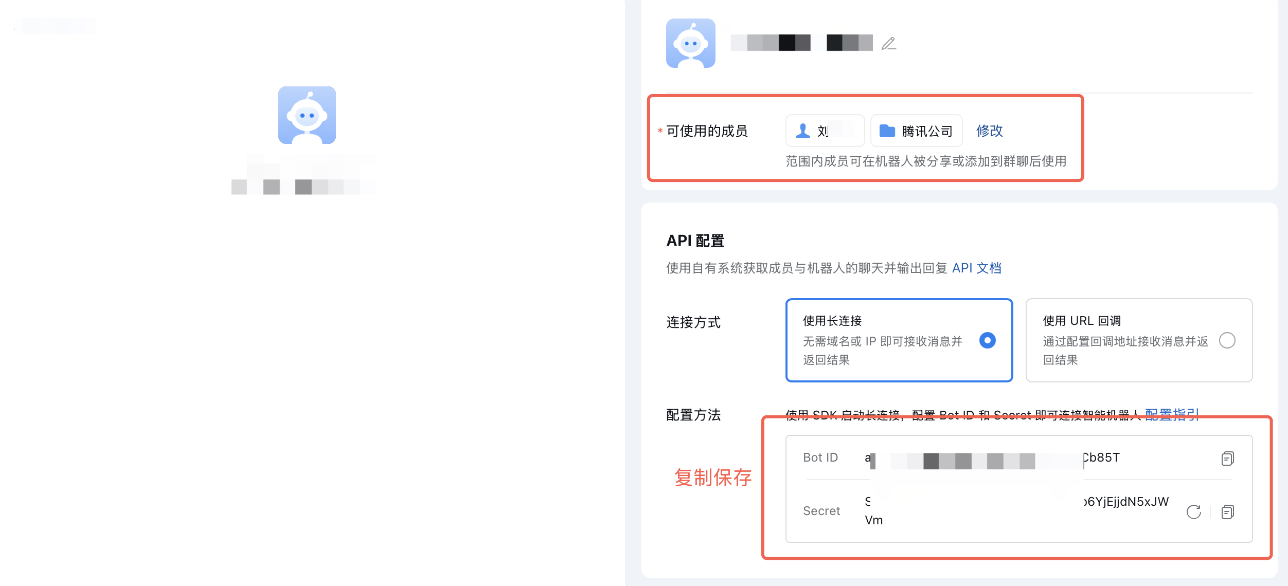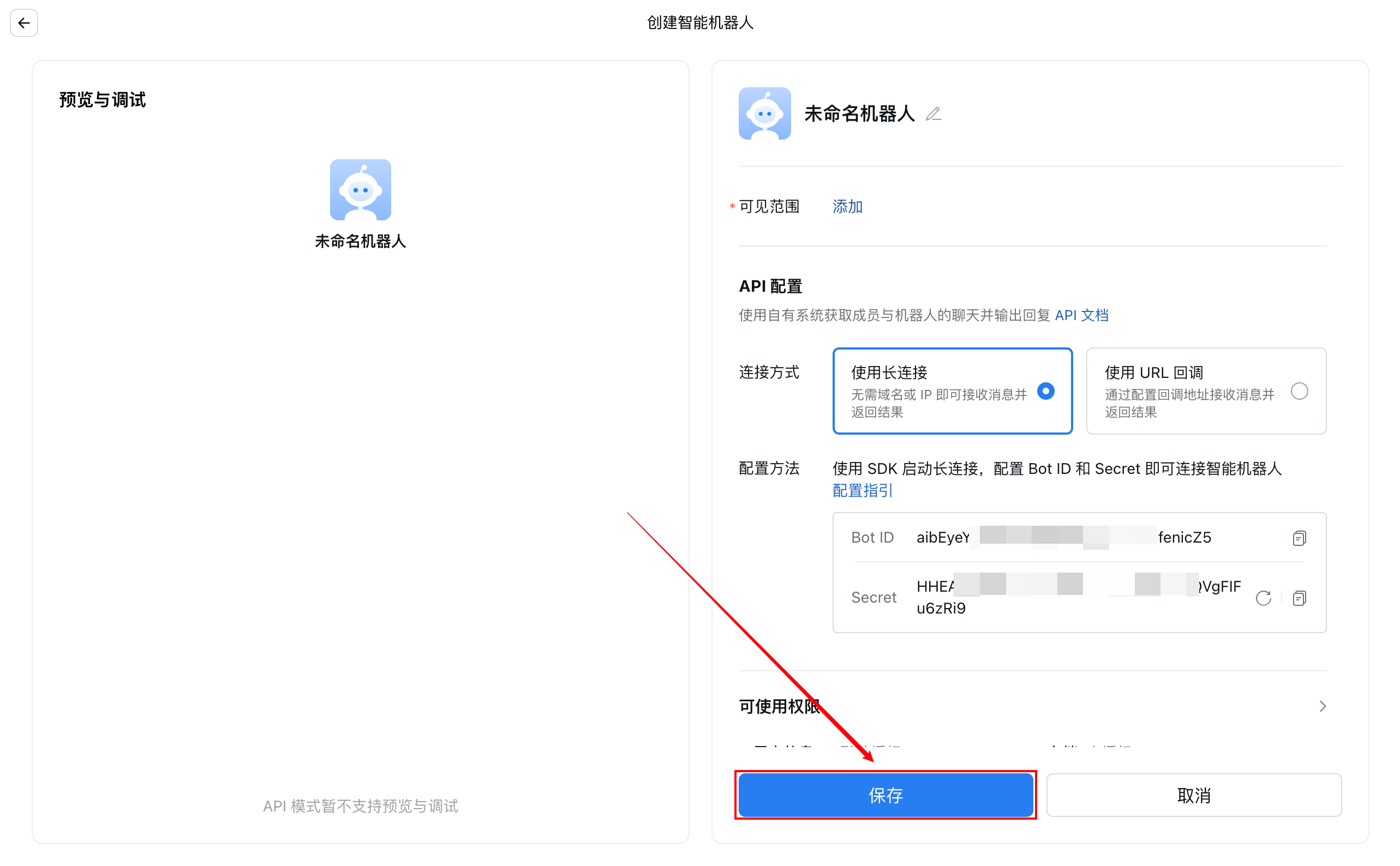 在 API 配置的连接方式中,选择使用长连接的方式创建,并单击 Secret 中的点击获取,获取机器人的 Secret。请记录配置方法中的 Bot ID 及 Secret,OpenClaw 配置通道时需要使用。