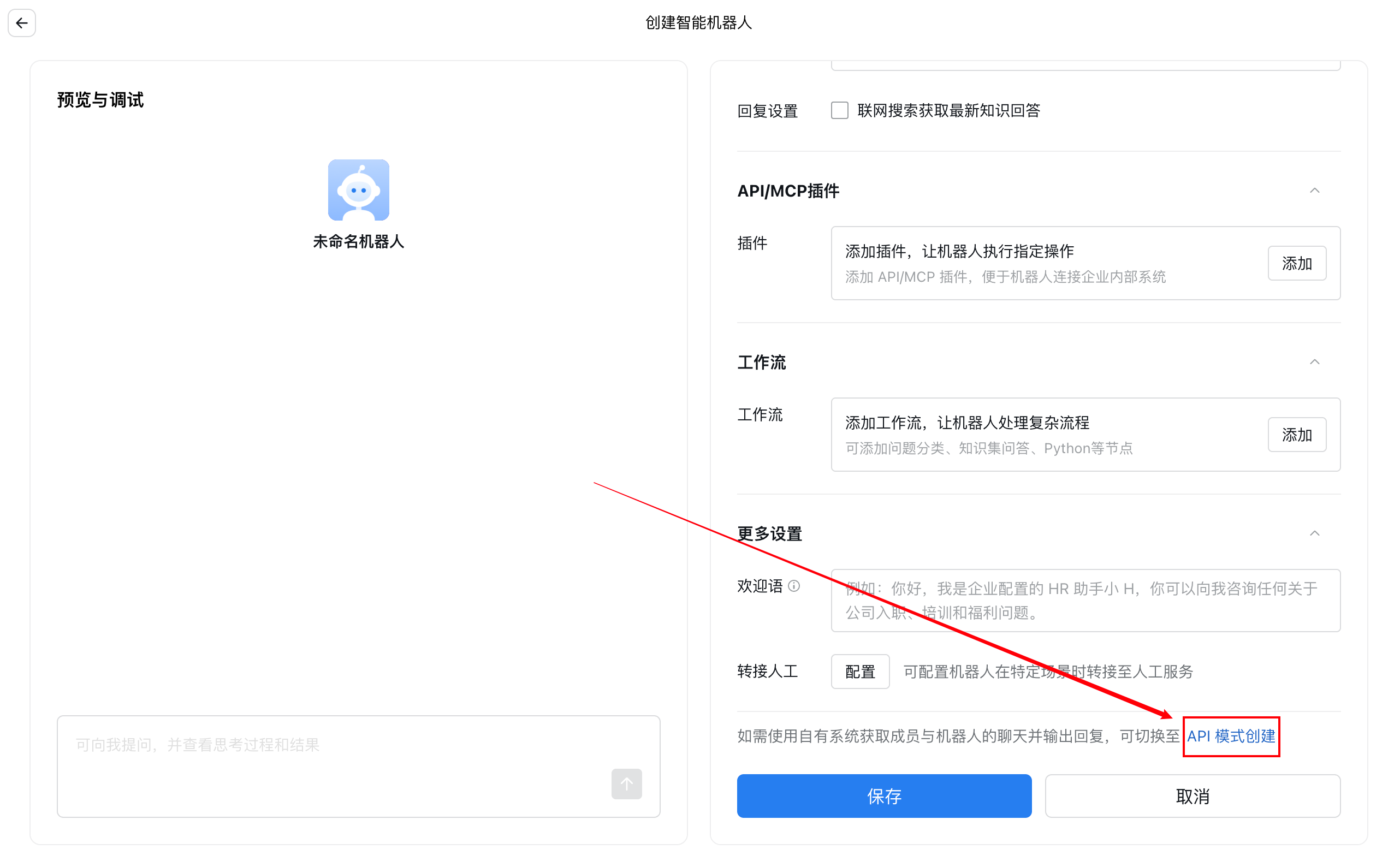 如您是企业员工,请跟企业管理员核实是否有创建智能机器人的权限设置。如具备权限,您可以在工作台中搜索智能机器人并参考后续步骤进行创建。