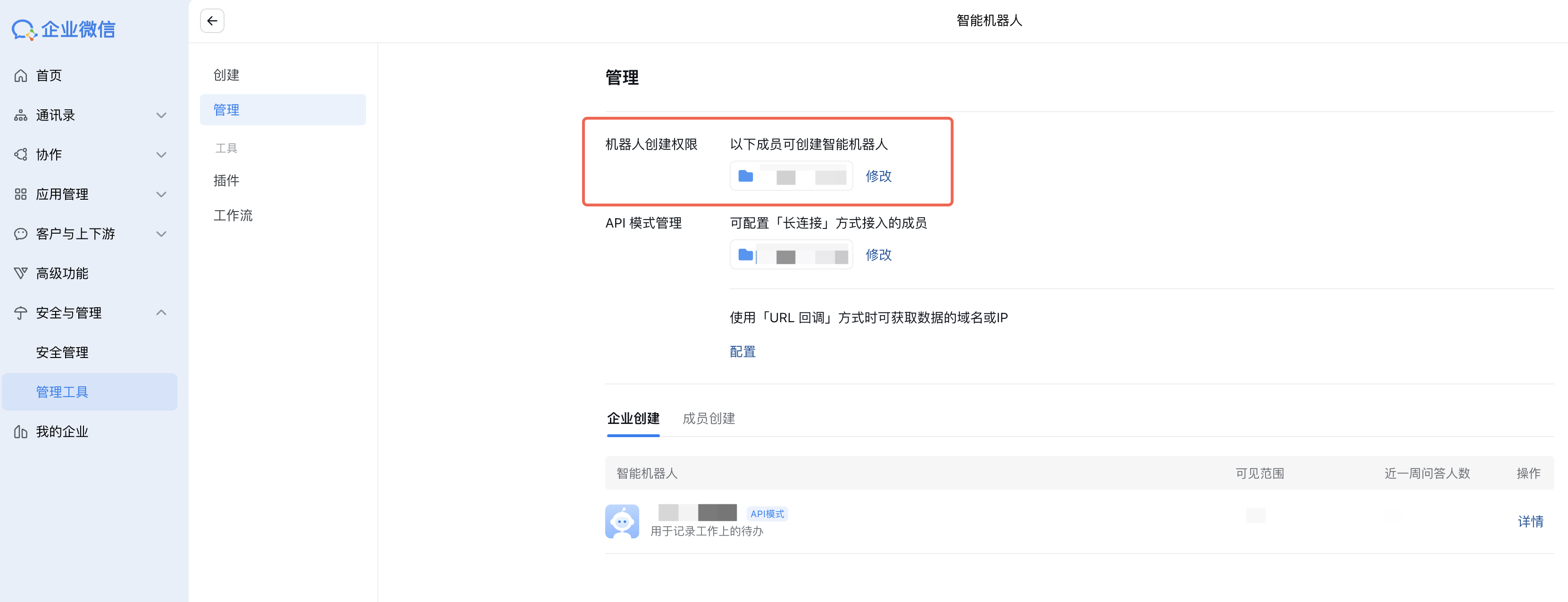 1. 在企业微信管理后台左侧导航中,依次找到并进入安全与管理 > 管理工具,选择智能机器人。