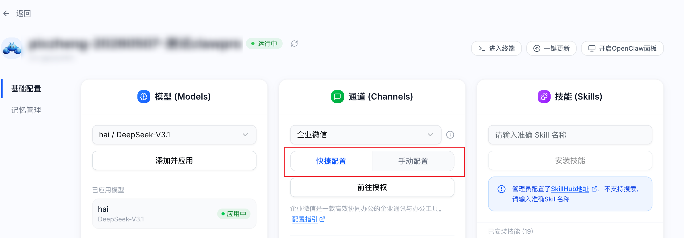 2. 在通道(Channels)中选择企业微信,您可选择快捷配置或手动配置两种方式进行配置: