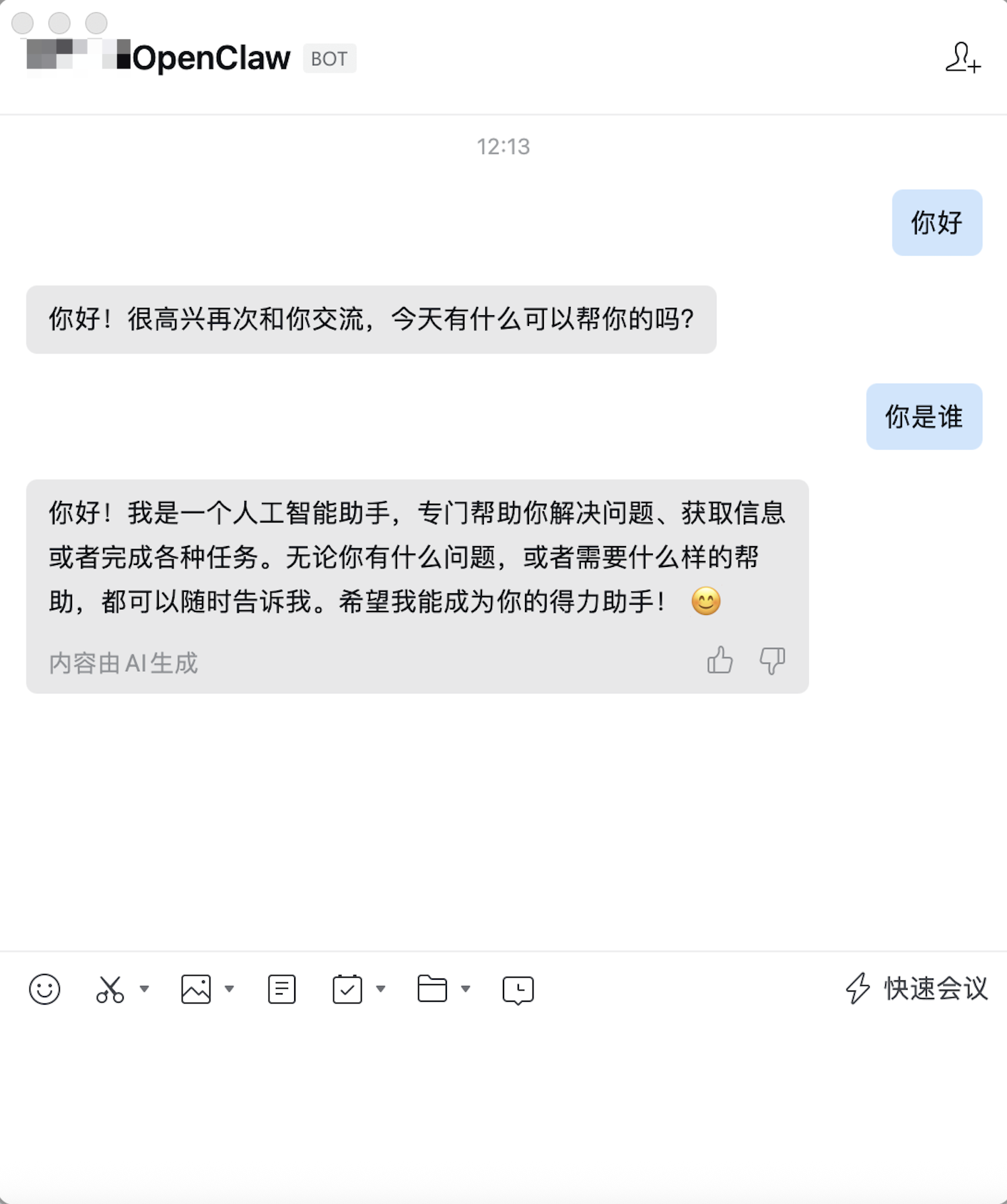 如企业微信机器人能够以 AI 的方式对话,则说明您已经成功完成 OpenClaw 接入企业微信机器人。