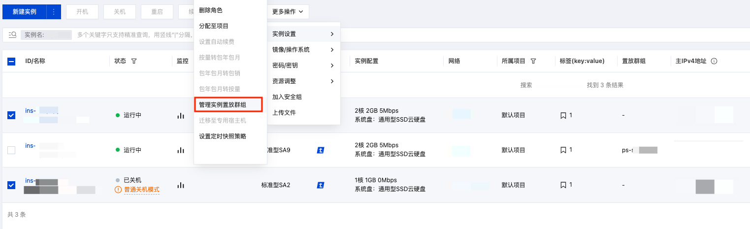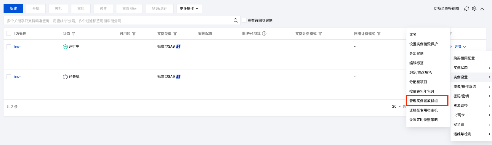 批量操作:勾选一个或多个目标实例,在实例列表顶部单击更多操作 > 实例设置 > 管理实例置放群组。