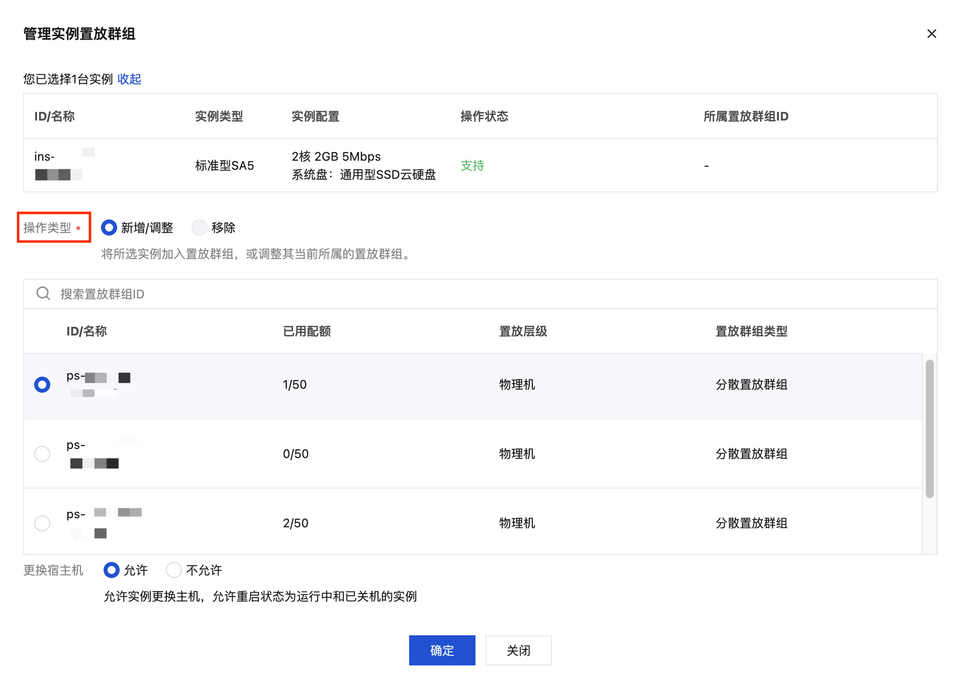 新增/调整:将未加入置放群组的实例加入到一个置放群组中,或将已加入置放群组的实例更换到另一个置放群组。