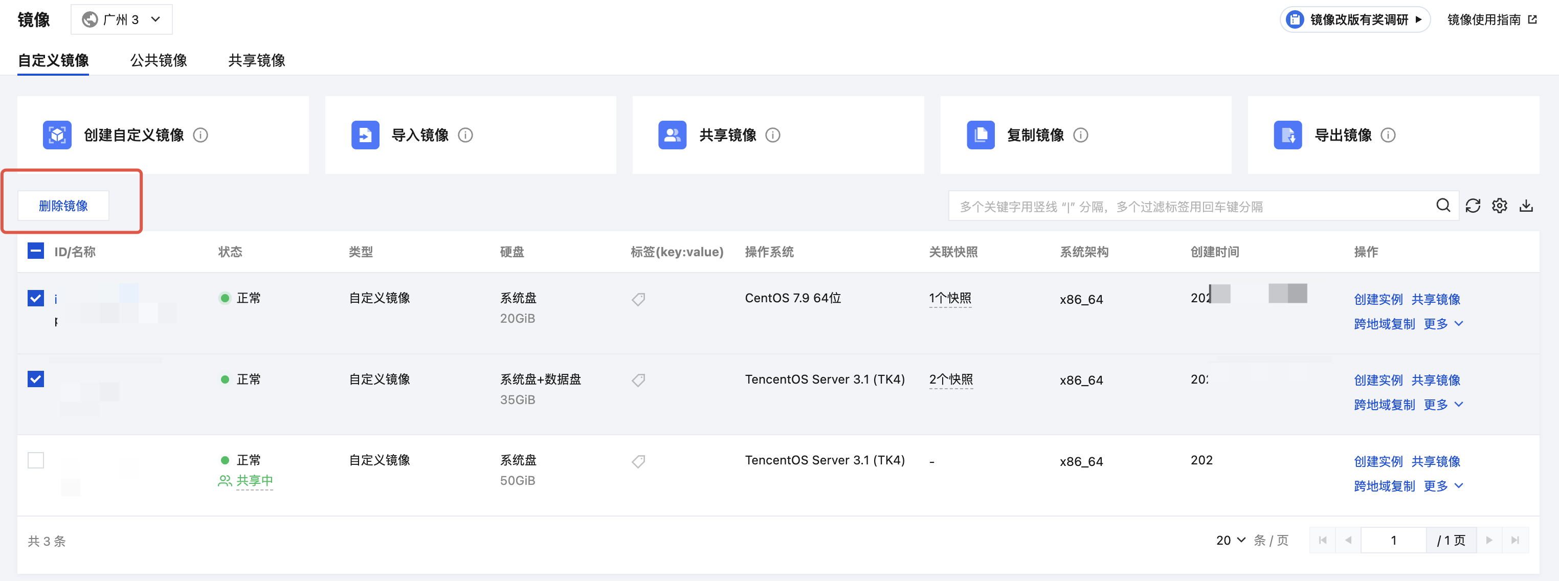 :列表中勾选所有要删除的自定义镜像,单击顶部