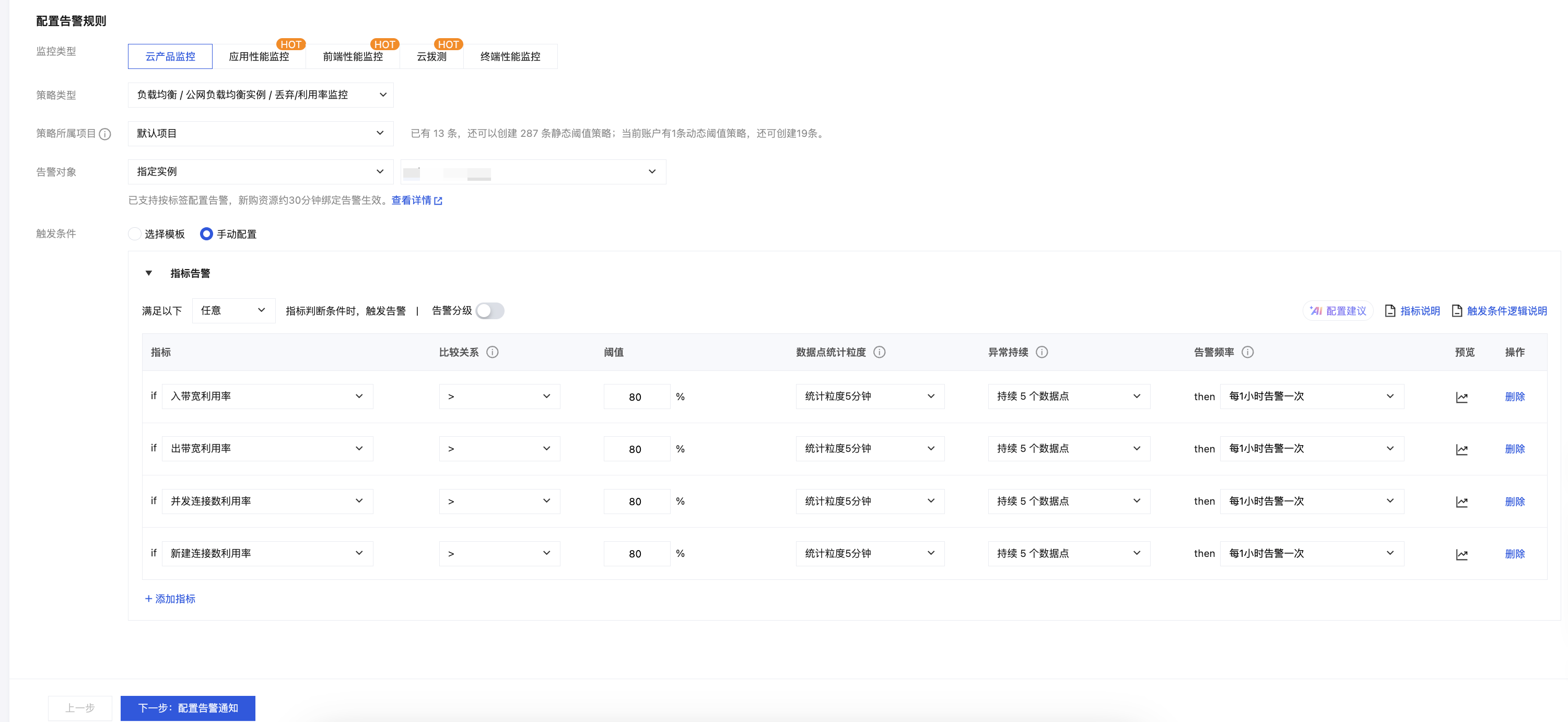 选择配置入带宽利用率、出带宽利用率、并发连接数利用率、新建连接数利用率,示例如下图所示。