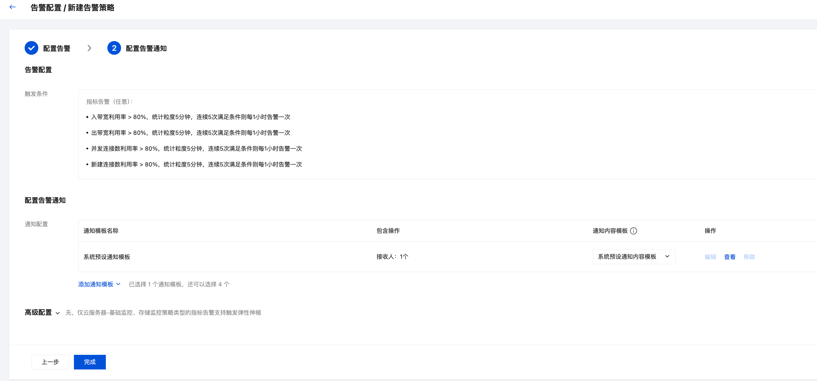 4. 单击完成,即可完成配置入带宽利用率、出带宽利用率、并发连接数利用率、新建连接数利用率的监控告警。QPS 利用率监控告警请参考上一步骤新建告警策略,修改策略类型为负载均衡 > 公网负载均衡实例 > QPS 相关监控,触发条件配置以下内容即可。
