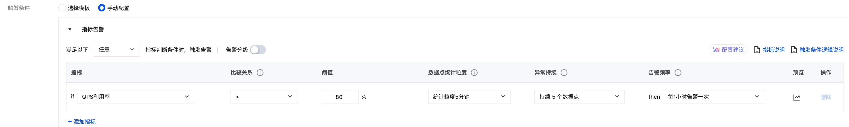 触发条件:告警指标、统计粒度、比较关系、阈值、持续 N 个监控数据点和告警频率组成的一个有语义的条件。