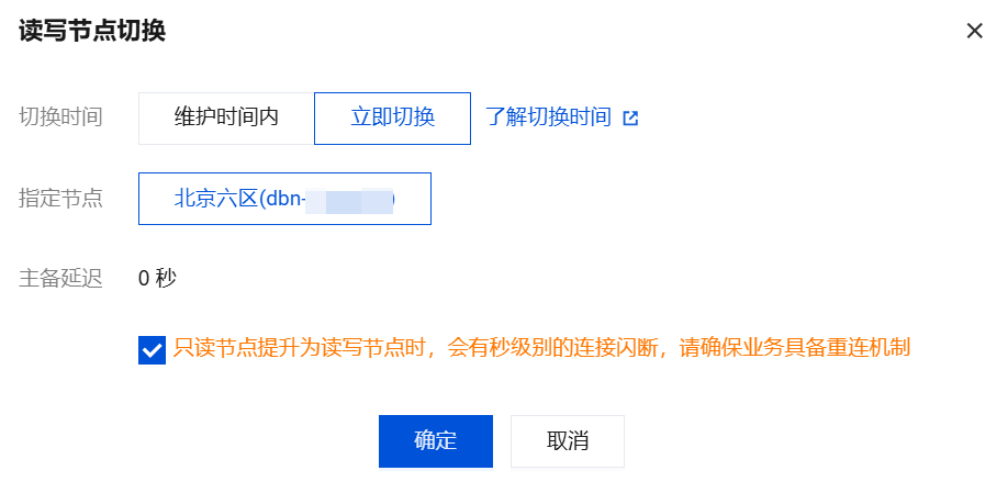 维护时间内:在维护时间内进行读写节点切换,修改实例维护时间可参见 设置实例维护时间。