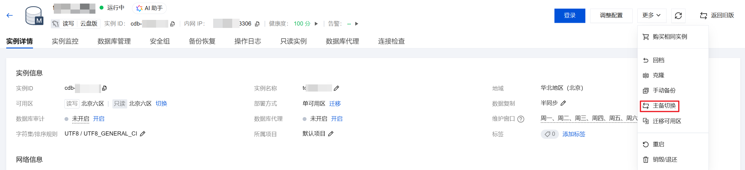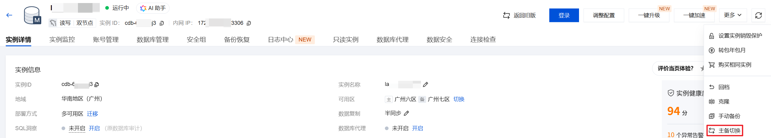 您也可以直接在实例管理页右上角,单击更多 > 主备切换。