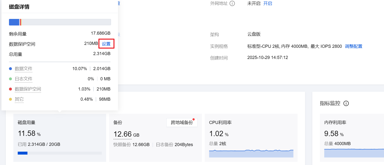 为保障数据库实例的可恢复能力,云数据库 MySQL 云盘版实例需要设置一定的空间用于数据库实例的数据保护,该部分空间无法存放数据,属于系统保护空间,防止数据写满后导致实例异常。