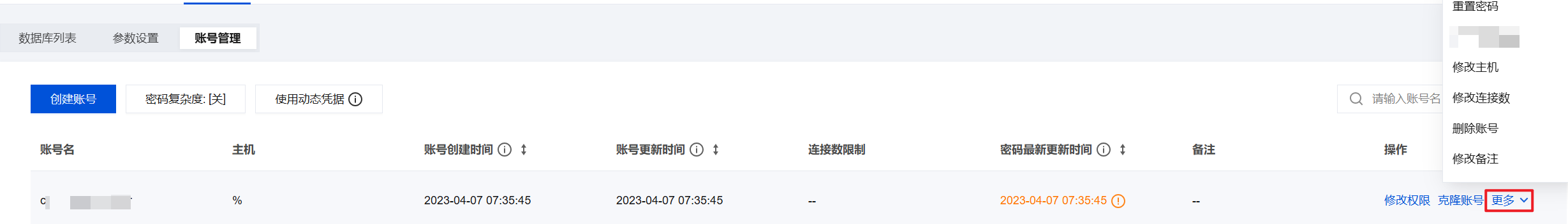 2. 在实例管理页面,选择数据库管理 > 账号管理页,找到需要修改连接数的账号,选择更多 > 修改连接数。