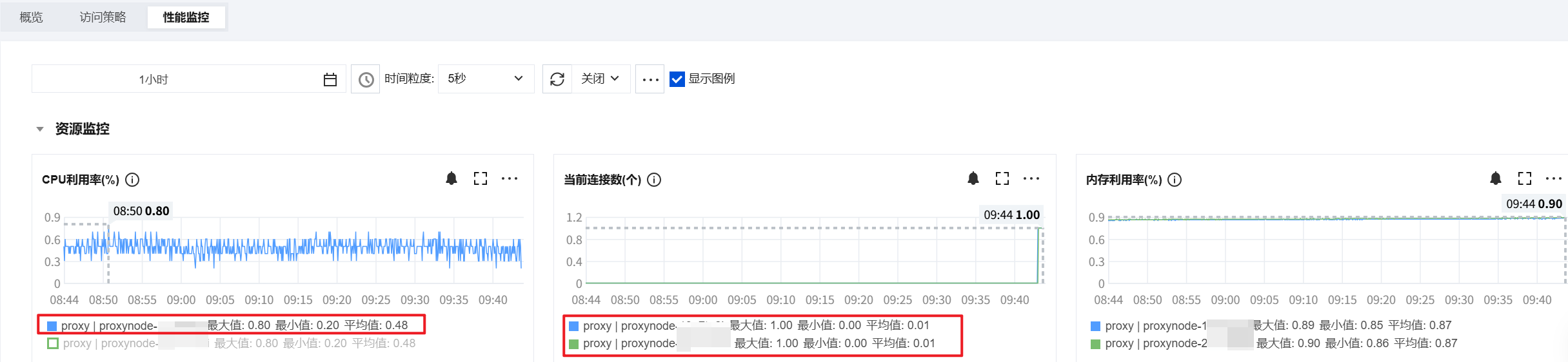2. 在实例管理页面,选择数据库代理 > 性能监控页,默认可以查看该实例下所有代理节点的监控,在某一指标的图例中单击对应代理节点,可只显示所选代理节点的指标情况。
