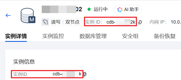 上述语句中的 server_name 为实例 ID,您可以在实例详情页获取目标实例的实例 ID,如下图所示。
