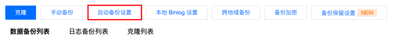1. 登录 MySQL 控制台,在实例列表,单击实例 ID 进入管理页面,选择备份恢复 > 自动备份设置。