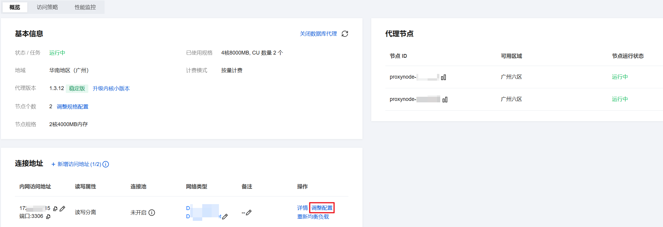 5. 开通成功后,支持通过数据库代理页 > 概览 > 连接地址下的内网访问地址直接访问数据库代理,支持对数据库代理地址的访问策略进行配置,在数据库代理 > 概览 > 连接地址下找到目标访问地址,单击其操作列的调整配置。