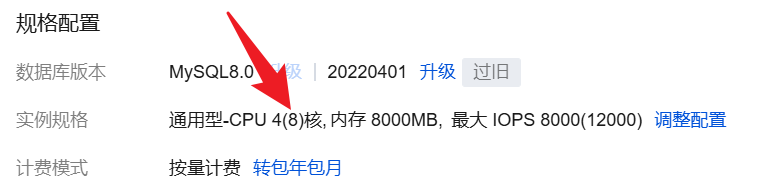 当实例的 CPU 平均利用率达到设置的自动弹性扩容阈值时,该实例会自动扩容。您可在实例详情页的实例规格后查询是否生效,若 CPU 核数后额外显示(实际核数),则表示生效。如下图所示,4(8)核表示当前已经是自动扩容到了8核。