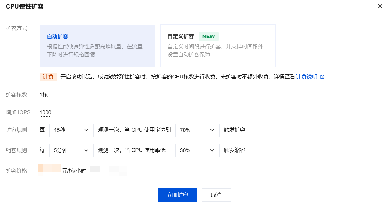 3. 在 CPU 弹性扩容窗口下,完成如下配置,确认扩容费用,单击立即扩容。
