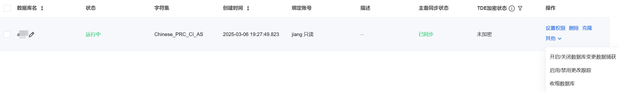 2. 在实例管理页面,选择数据库管理页,选择目标数据库所在行,在操作列选择其他 > 开启/关闭变更数据捕获。