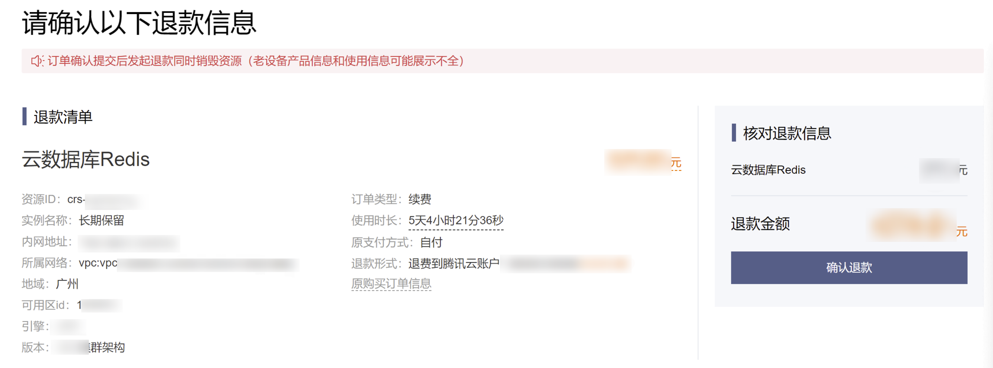 5. 在请确认以下退款信息页面,确认退款清单,包括:实例信息、网络信息、地域与可用区、退款形式等,并核对退款金额,单击确认退款。