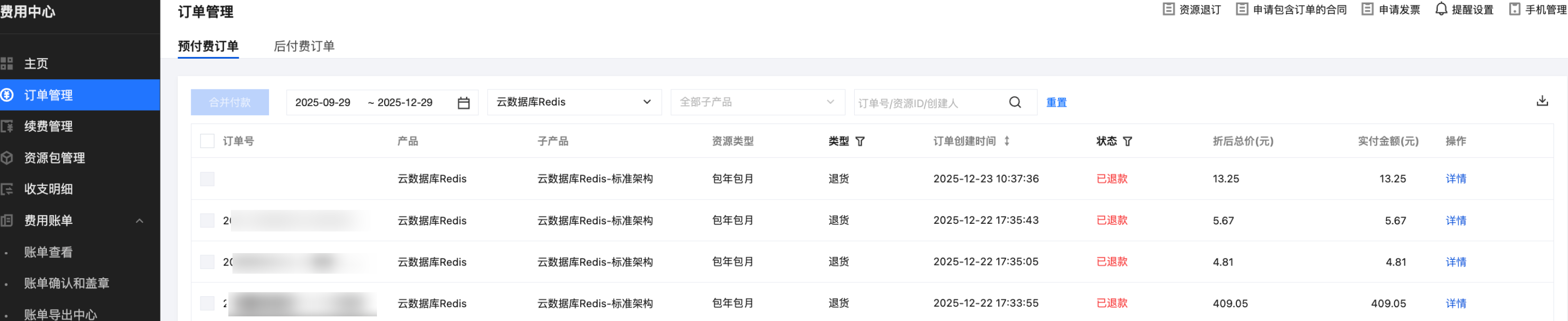 单击查看退款进度,进入费用中心的订单管理页面,在预付费订单页签可随时跟踪退款进度。如下图所示,在操作列,单击详情,可查看该订单的详细信息。单击右侧导航栏的收支明细,可查看退款到账。