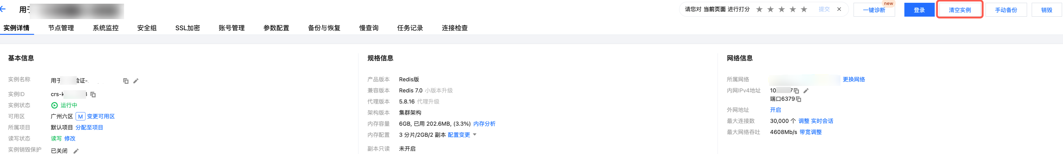 云数据库 Redis® 支持在控制台一键清空实例所有数据。清空实例将对实例进行 FLUSHALL 操作,实例数据将被全部清理,且清空之后无法恢复,请谨慎操作。