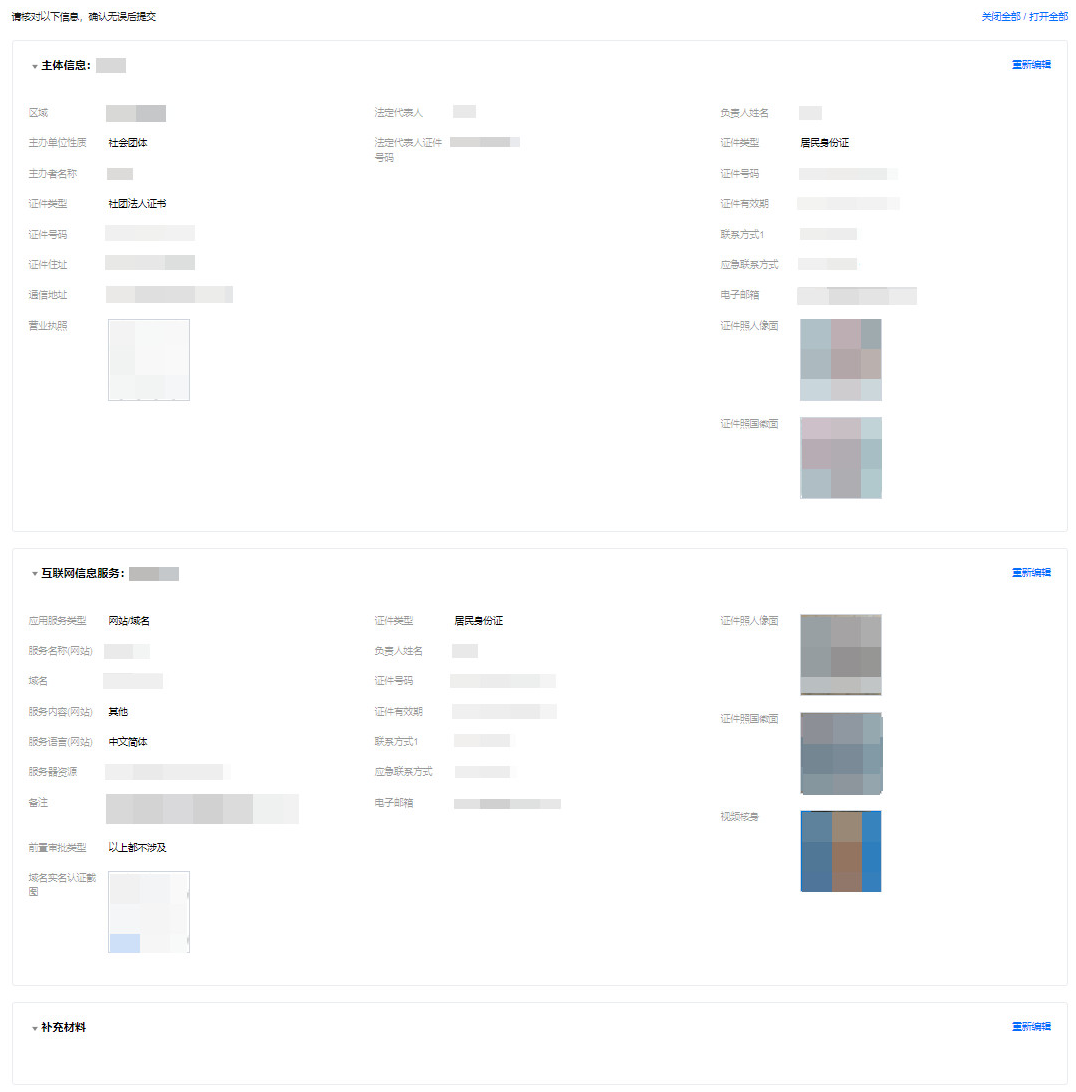 2. 在服务负责人信息(网站/域名)模块,上传相关材料以及填写相关信息。如下图所示: