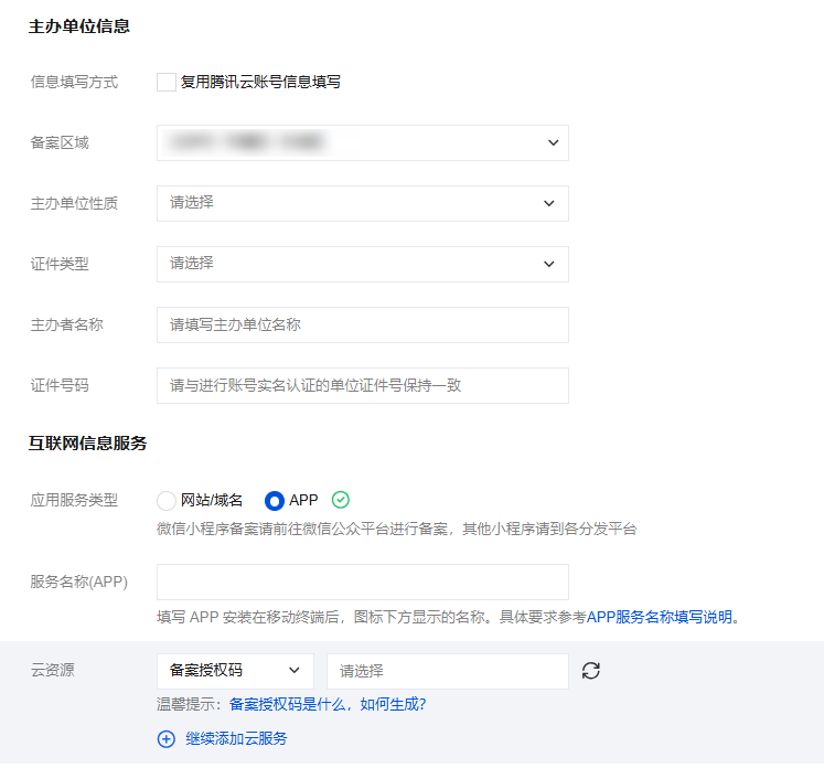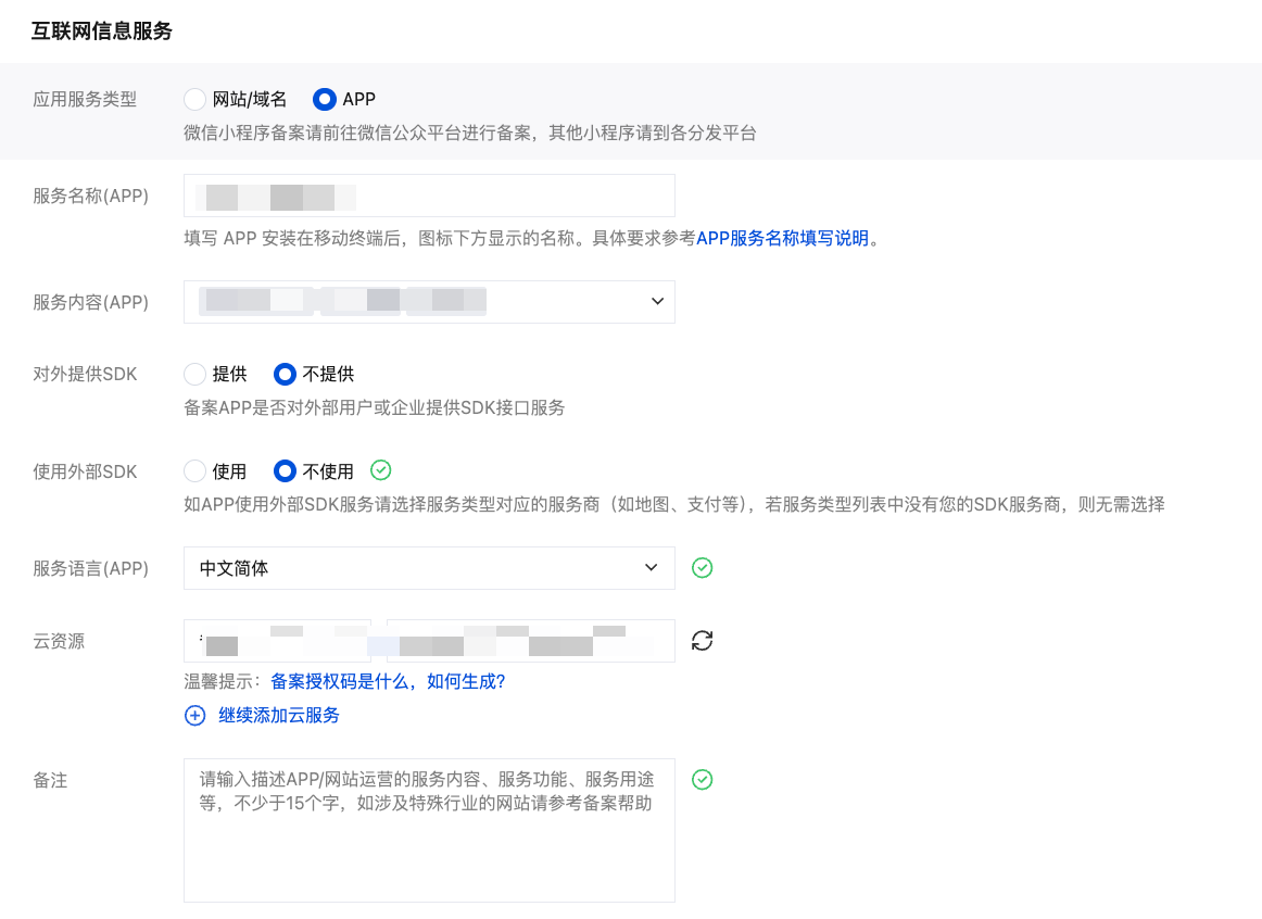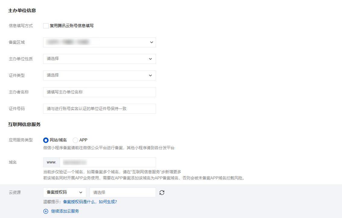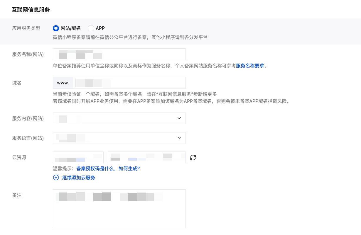 在互联网信息服务模块,根据您业务诉求选择网站/域名或者 APP 备案,并填写相关信息。