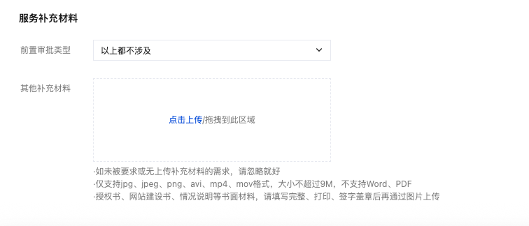 3. 在服务补充材料模块,上传相关材料,如下图所示: