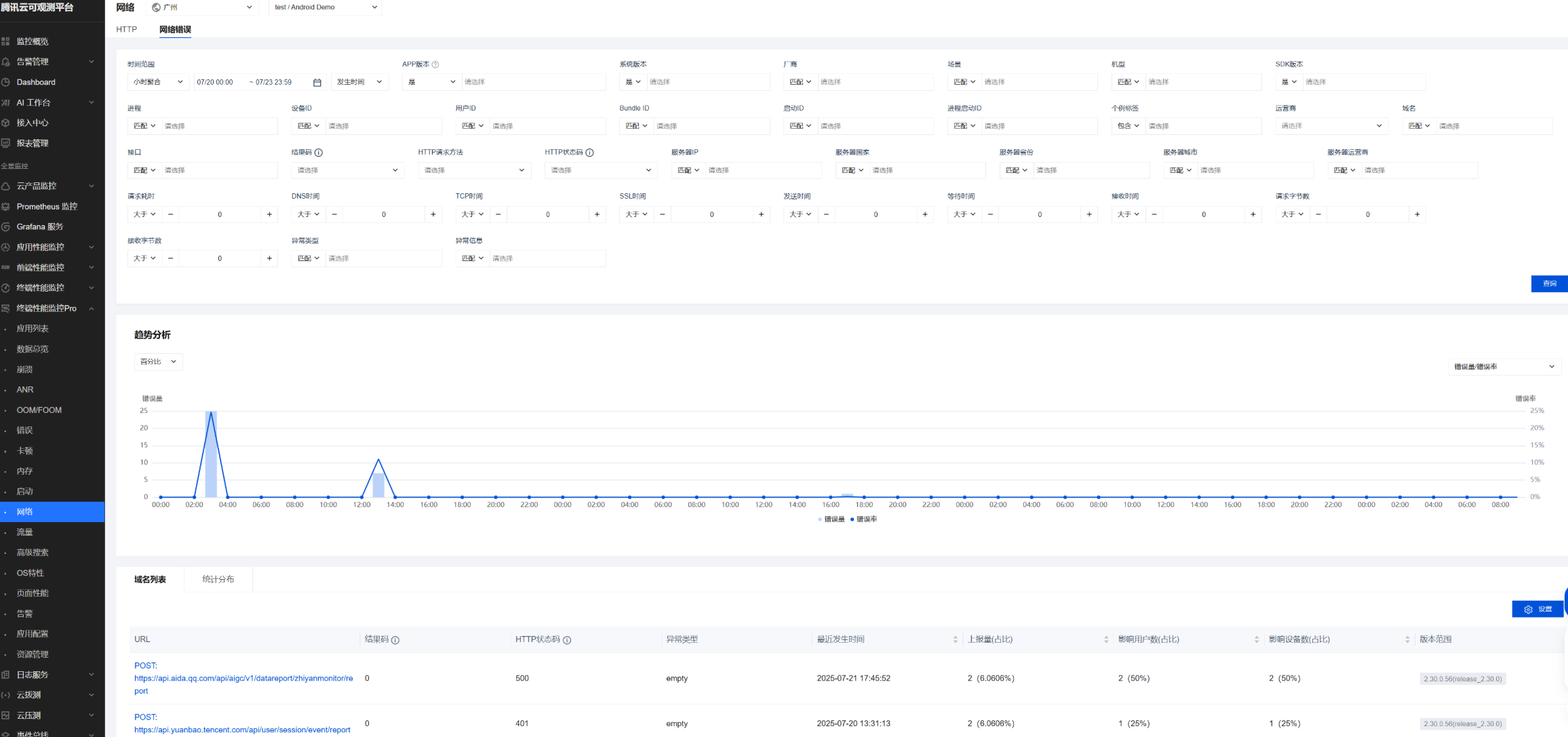 HTTP 模块:默认展示最近7天的数据,包含按上报量排序的 Top 域名和接口、整体趋势、统计分布情况,以及按 URL 聚合列表。
