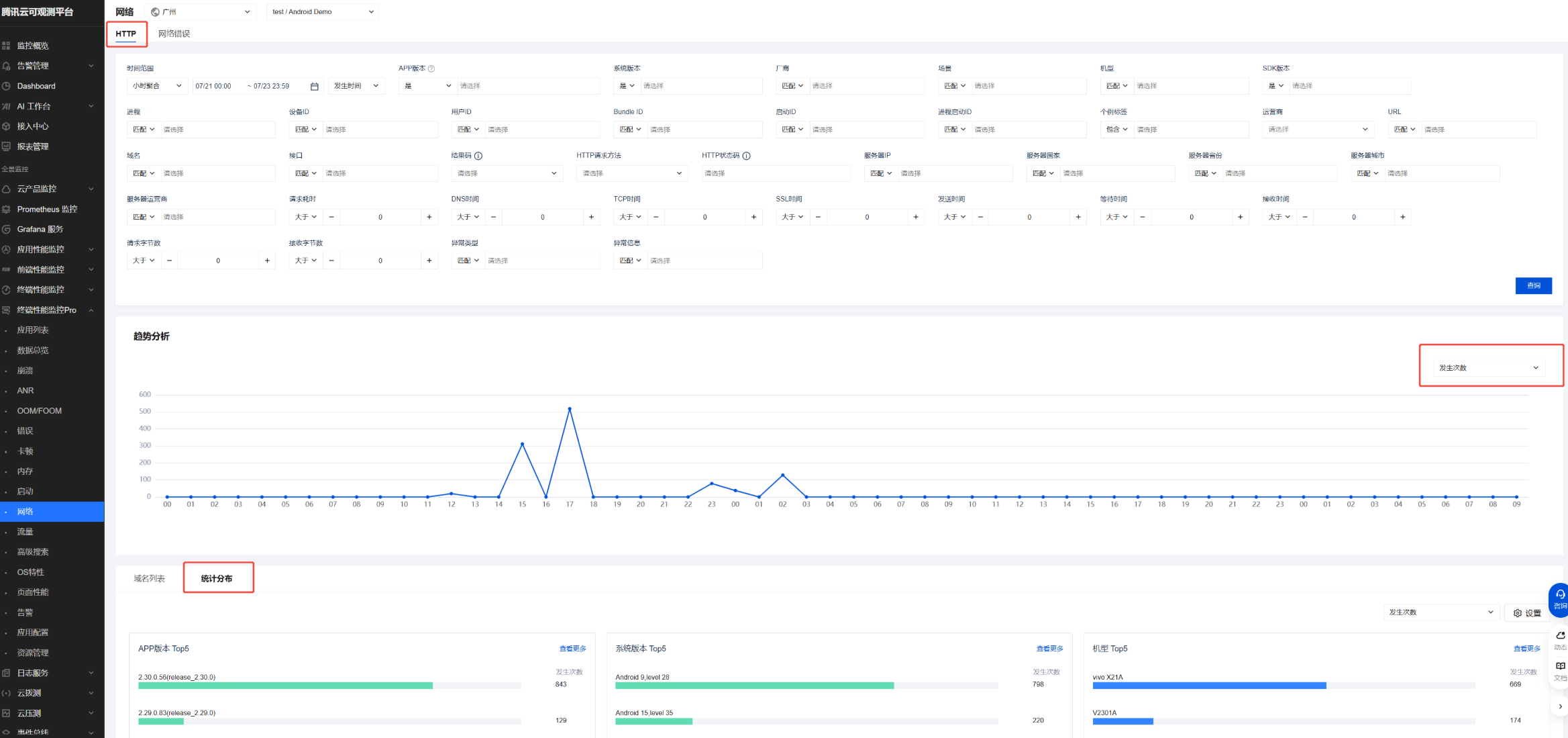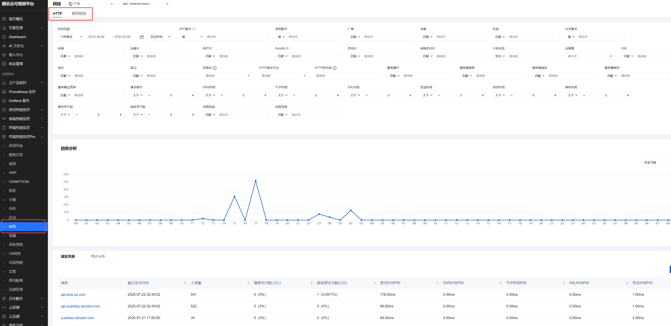 HTTP 模块包含所监控到的所有 HTTP 请求的质量数据,如成功率、请求耗时、重要阶段耗时、传输数据大小等。