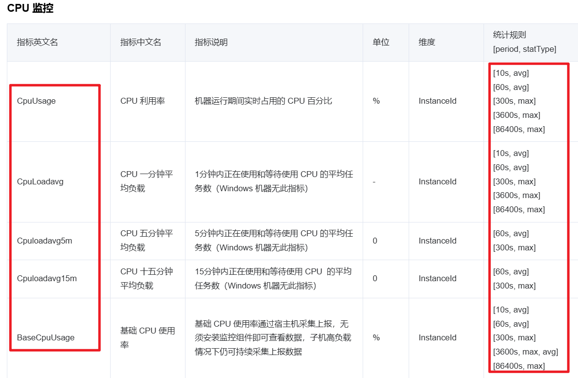 本文以云服务器 CPU 利用率指标为例。 1. 查看 云服务器监控指标文档。 2. 找到 CPU 利用率指标,即可查看 CPU 利用率指标名、维度以及统计粒度等相关信息。