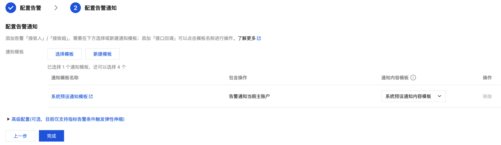 3. 单击下一步:配置告警通知,您可选择或新建通知模板用于接收告警信息,新建模板可参考 新建通知模板 。