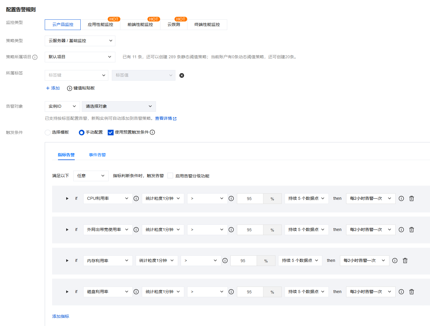 2. 单击新建策略,在选择监控类型和策略类型后,系统将自动设置对应云产品的告警策略常用触发条件。用户也可以自定义配置指标告警,配置说明如下: