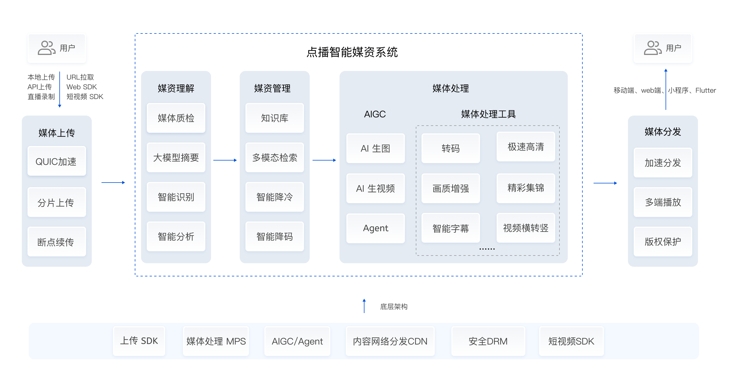 媒体分发:通过加速分发、多端适配(移动端、Web 端、小程序、Flutter 等)及版权保护机制,确保内容高效、安全触达用户。