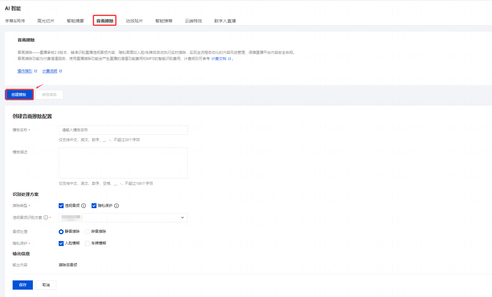 5. 单击创建模板,进入音画擦除模板创建页,进行如下配置: