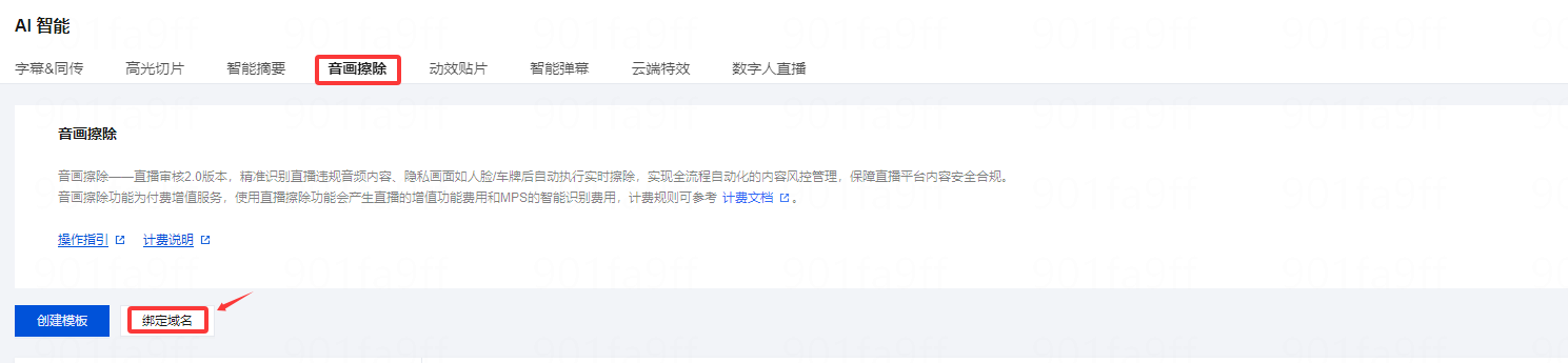 新音画擦除模板创建成功后关联域名:音画擦除模板创建成功后,单击提醒框中的去绑定域名。