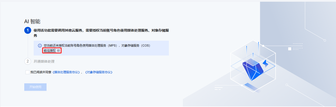 4. 授权成功后,勾选服务协议并单击开始使用,系统将自动开通媒体处理产品及对象存储服务(COS),同时跳转至高光切片管理页面。