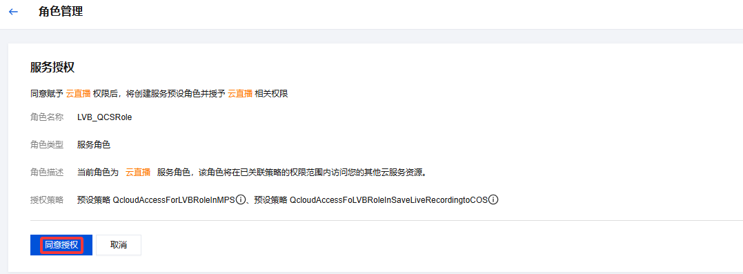 3. 在角色管理页面,单击同意授权,完成身份校验后即可完成媒体处理和对象存储服务(COS)授权,正常使用媒体处理服务和对象存储服务。