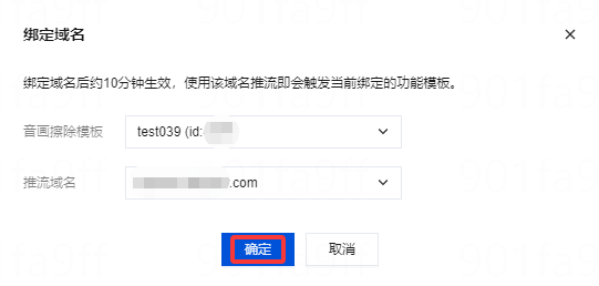 3. 在域名绑定窗口中,选择您需绑定的音画擦除模板及推流域名(可同时绑定多个推流域名),单击确定即可绑定成功。