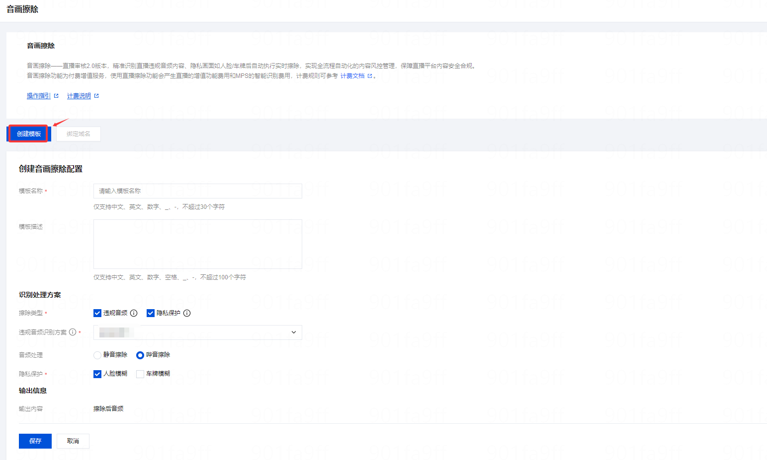 识别处理方案 | 擦除类型 | 擦除类型支持违规音频和隐私保护,可单选或者复选。 违规音频:识别直播音频中的违规文字内容,并进行消音处理,有效保障直播内容安全。 违规音频识别方案:绑定直播审核模块中审核内容为音频文本识别的模板。 音频处理:单选项,支持选择静音擦除或哔音擦除,默认静音擦除。 隐私保护:识别直播画面中的人脸、车牌、旗帜等,并进行模糊处理,有效保障直播内容隐私。 隐私保护:必填选项,支持单选或复选人脸模糊或者车牌模糊。 |