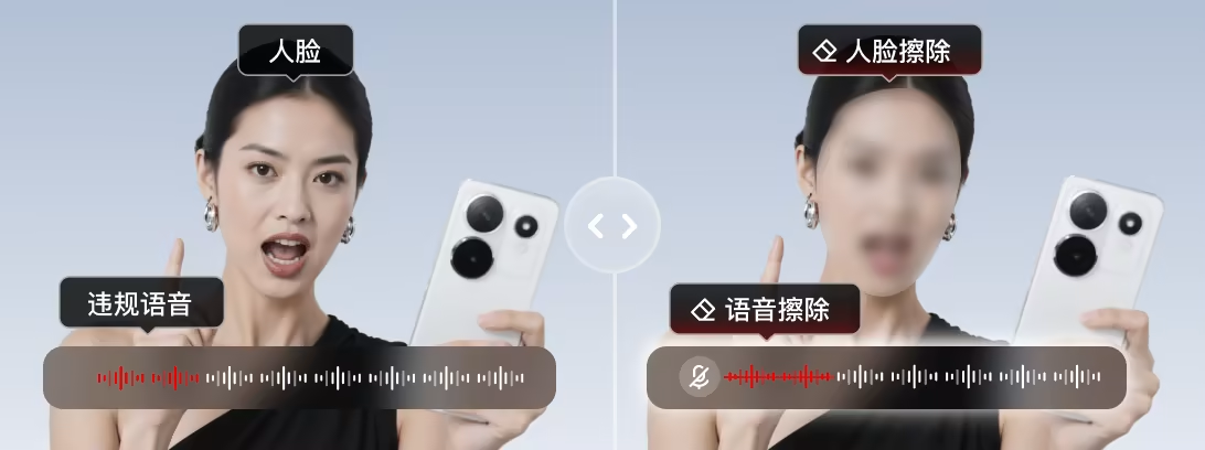 音画擦除——直播审核2.0版本,精准识别直播违规音频内容、隐私画面如人脸/车牌后自动执行实时擦除,实现全流程自动化的内容风控管理,保障直播平台内容安全合规。