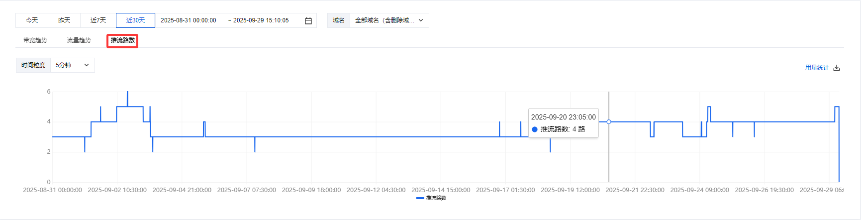 推流路数 | 统计所选推流域名在查询的时间段内推流的路数。 |