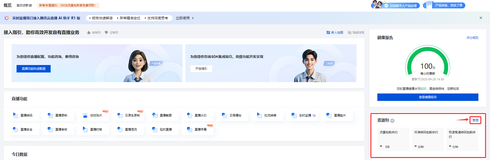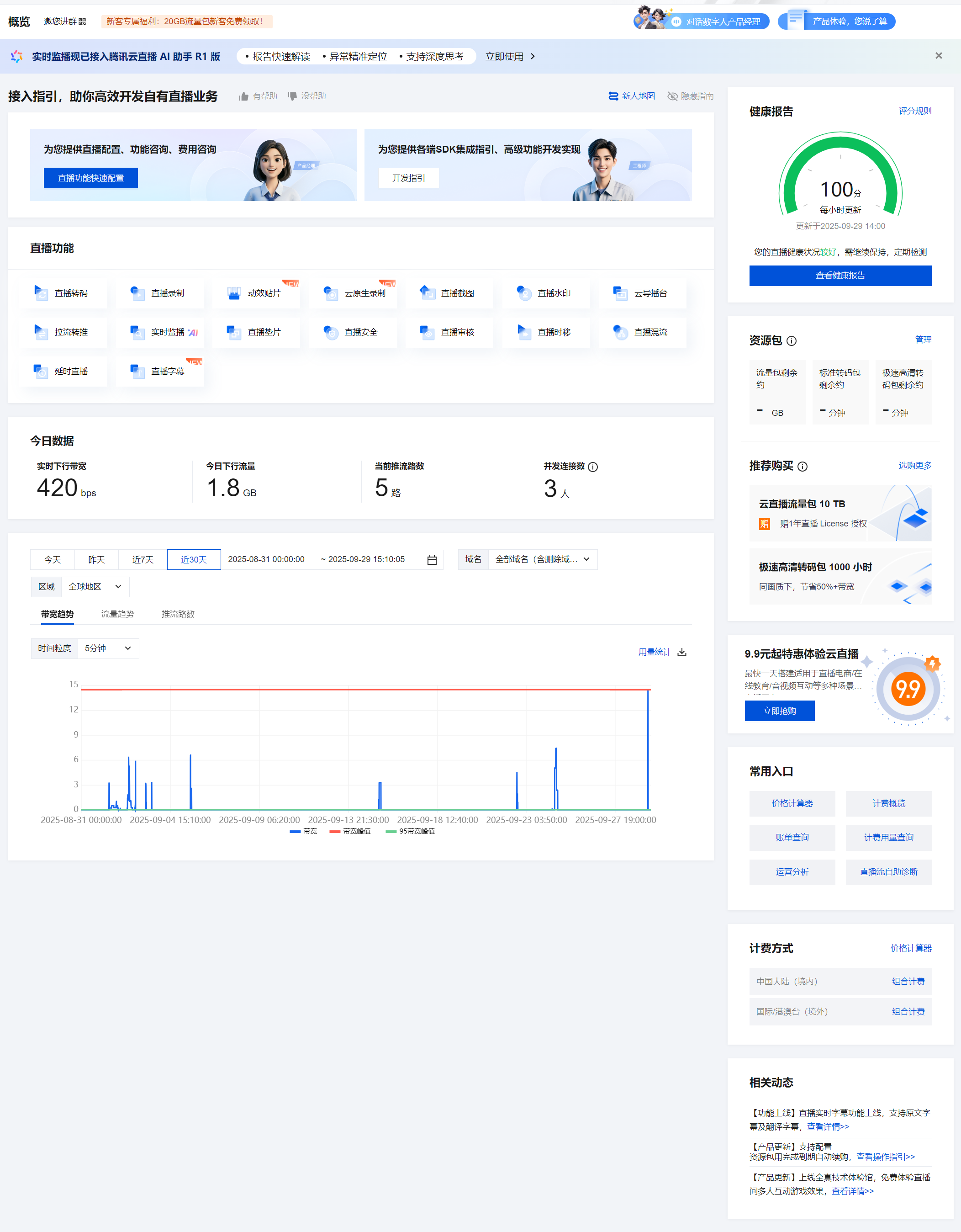 您可以查看实时下行带宽、今日下行流量、当前推流路数、并发连接数以及近30天的计费带宽、计费流量和推流路数的趋势等相关数据。此外,您还可以查看健康报告和资源包消耗详情,并根据需求切换计费方式或更改时间粒度。如需新手指引,您可以单击右上角的指引,查看云直播入门步骤指引。